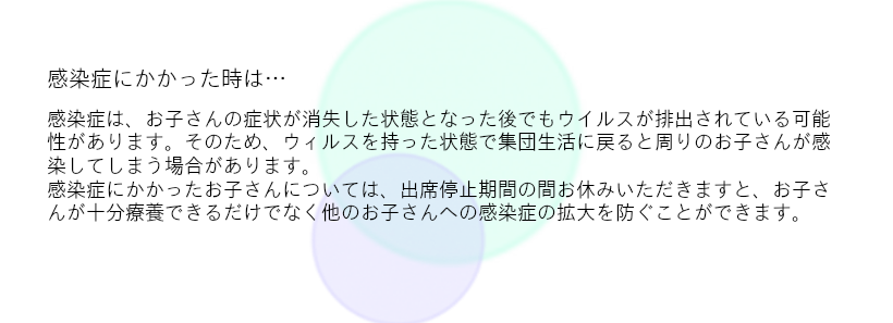 ・飲用には水筒を持参していただき、こまめに水を飲んでいます ・定期的に換気をしています(夏場は常時) ・二酸化炭素濃度測定器を設置し、1,000ppm以下に保つよう配慮しています ・食事の前には、手洗いに加えコロナウイルスやノロウイルスに対応している 消毒液で手指を消毒しています ・大勢が触れる玩具は使用前に手洗いや消毒をしています ・園に入る際にはアルコール消毒をしていただいています ・日常の次亜塩素酸ナトリウム水による清掃に加え、 手が触れるものや場所は、使用後または定期的に次亜塩素酸ナトリウム水での 拭き取りや除菌・抗菌剤での噴霧消毒を行っています 玩具は定期的に除菌・抗菌剤や次亜塩素酸ナトリウム水、アルコールによる消毒を しています ・通園バスにはイオンクラスター除菌脱臭装置を導入し、定期的に消毒も行っています ・保育室や遊戯室に、オゾン殺菌装置、イオンクラスター除菌脱臭装置、 次亜塩素酸空気清浄機を、給食室には電解水生成装置を導入しています |