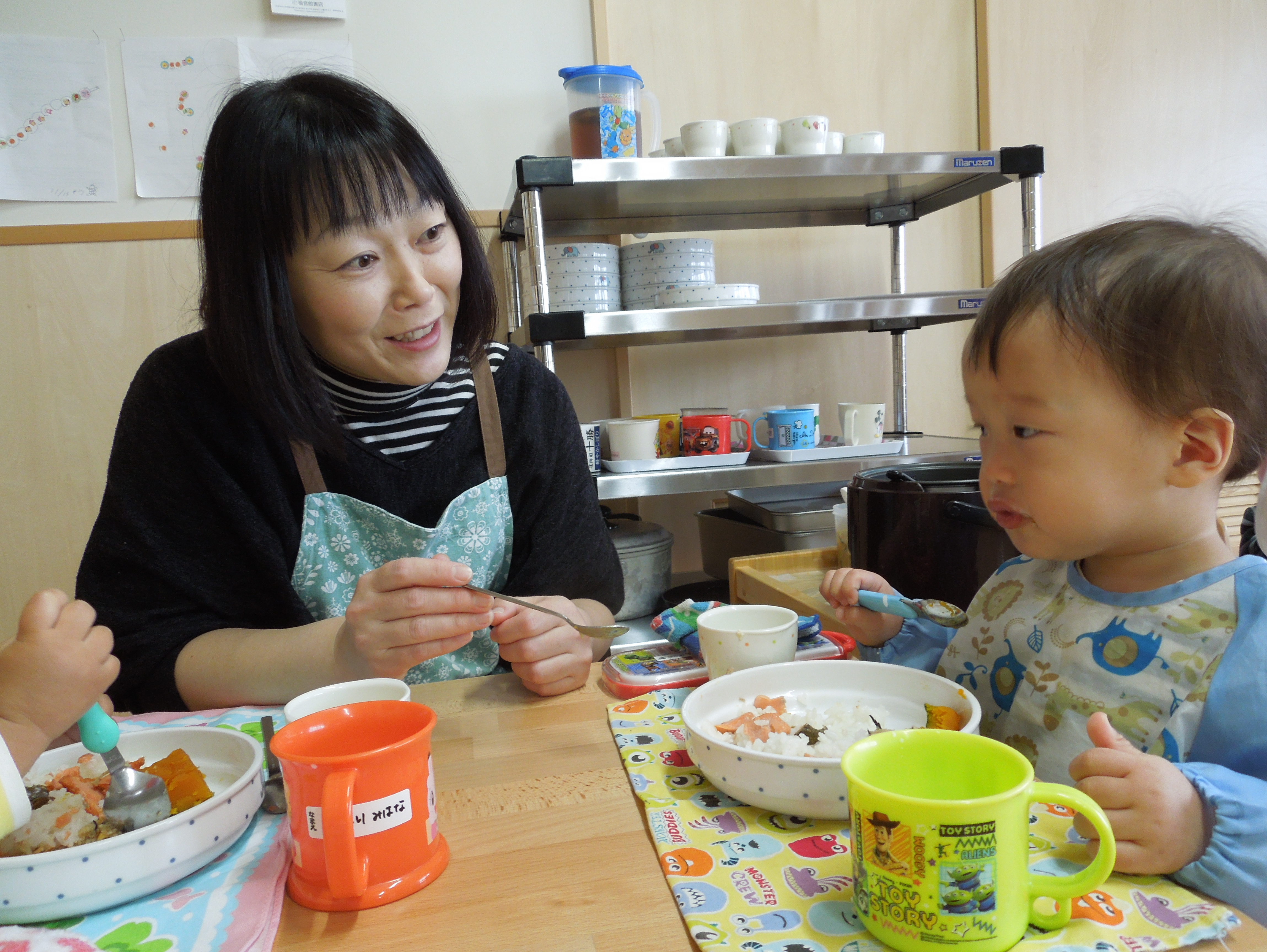 1・2歳児の保育では、安心して過ごし、1人ひとりの育ちをより細かく見ることを大切にし、身の回りの生活環境だけでなく生活そのものにおいても家庭に近い環境作りをしています。家庭にいるように生活(日課)が流れ、その中で育ちに必要なあそびが展開されます。