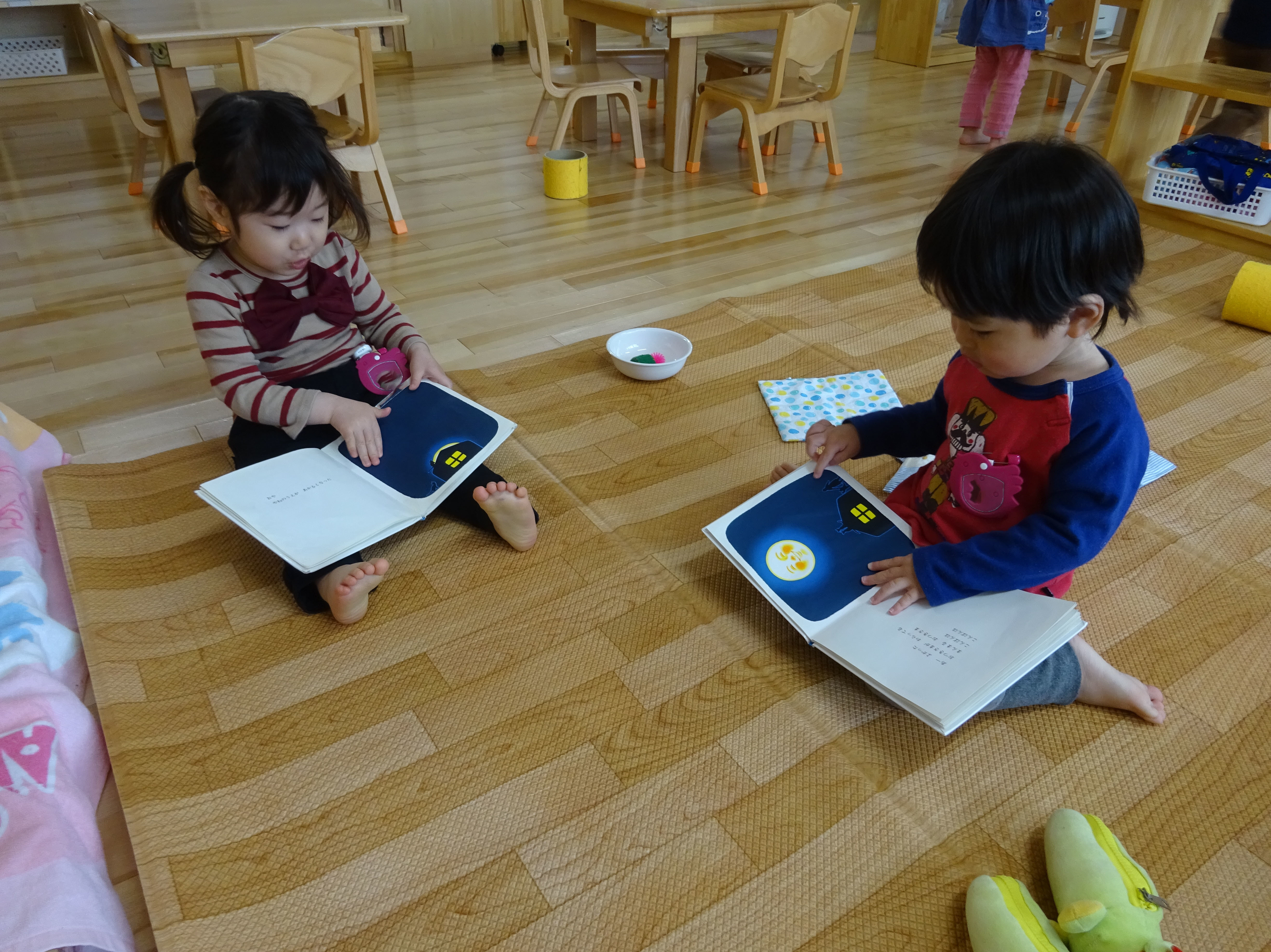 幼児期から共同のあそびを始めるベースとなる1・2歳児のあそびでは、発達段階に合わせた教育内容(あそび)を、個人または集団にその都度提示することや、意欲が十分に満たされるまでひとつのあそびに没頭できるよう、様々な粗大でじっくとあそび込む中で見立てたり工夫したりする経験を大切にしています。